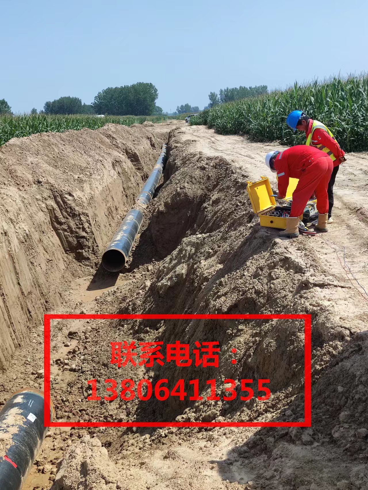 河南某定向钻穿越现场,进行管道馈电试验,管道道侣电阻率检测,防腐层质量评估
